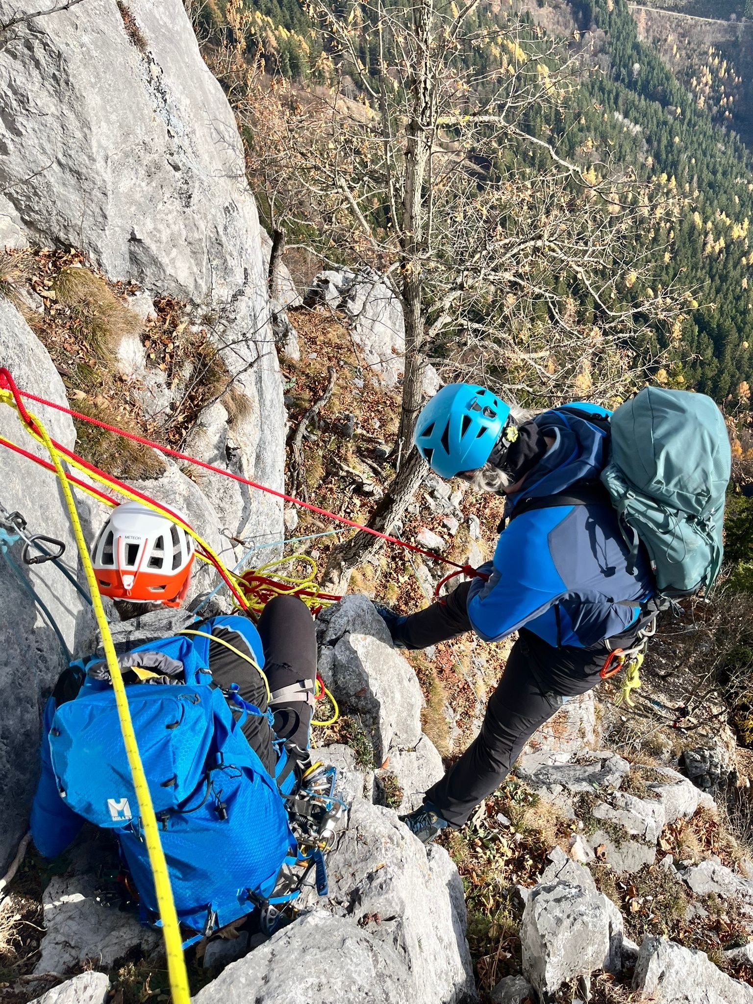 Ob prihodu smo se razdelili v naveze in si razdelili opremo. Toplo jutro, v katerega smo se zbudili v Celju, nam je sledilo le do avstrijske meje, zato nam je polurna hoja do izhodišča dobro dela. Tam je sledila hitra ponovitev komunikacije v navezi, nato pa smo že podajali vrv. Naš trud je nekaj časa nadzorovala družina gamsov. Očitno so bili z videnim zadovoljni, saj z nami niso ostali dolgo.