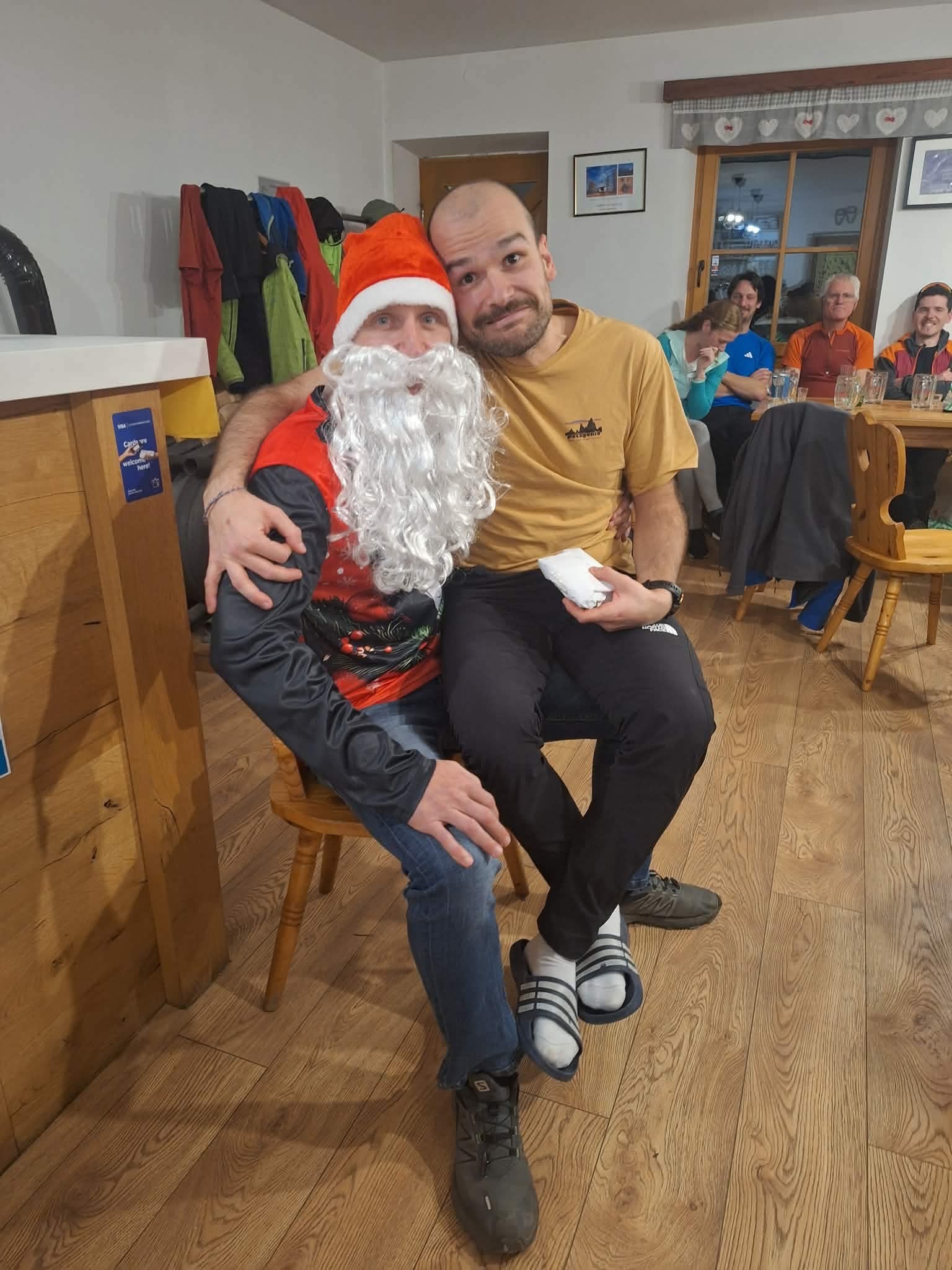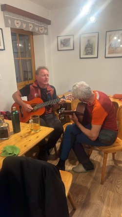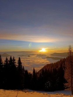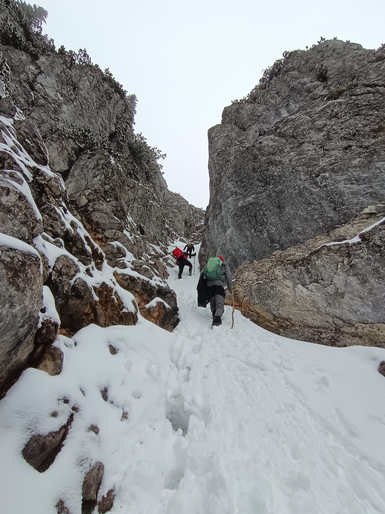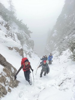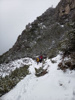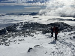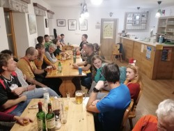 Svoje vtise o zaključku sta tako zbrala tečajnika Katarina in Uršek: Tradicionalno skupinsko turo je s svojim predlogom nekoliko začinil oskrbnik koče in tako se nas je 11 podalo proti vrhu po žlebu. Po neuspelem poskusu vzpona po premalo zasneženem žlebu je padla odločitev za vrnitev po isti poti. Tečajniki smo tako pridobili dve pomembni izkustvi: naučili smo se kako (ne)planirati ture in doživeli svojo prvo opuščanje smeri – kar menda pomeni, da bo naslednjič ta odločitev lažja. Vrh smo tako dosegli po "normalki". Popoldne in zvečer je sledil uradni del z nagovori, poročili, skritim Božičkom (tokrat kar v dvojni zasedbi) ter krstom, kjer so v nazive napredovali trije pripravniki. Sledil je sproščeni del - z glasbenimi vložki članov Grmada banda in gostujočimi pevci. Tekom večera se je izkazalo tudi, da naj bi tečajniki prinesti žig iz vrha, tako sva to nalogo malo po polnoči pogumno prevzela tečajnika Katarina in Miha v spremstvu mlajšega pripravnika Nejca. Nočna odprava je bila zelo dragocena izkušnja, Nejc je odlično predajal znanje (hoja z derezami, orientacija, uporaba cepina, znaki podhladitve, preverjanje snežne podlage), hkrati pa je bila hoja ob svetli luni in deloma jasnemu nebu, s čudovitimi meglicami v dolini in ravnimi linijami oblakov, ki so se skorajda stikali z zasneženo pokrajino, čudovita. Manjkalo ni niti zagretosti in zdrave trme, da prinesemo v dom žig, po katerega smo bili poslani, ter sproščenega klepeta. V kočo smo se vrnili nekaj minut pred pol tretjo uro zjutraj. Razposajeno prepevanje je za nekatere trajalo vse do zajtrka, za kar je s svojo gostoljubnostjo (vmesna peka pic) poskrbela ekipa doma. Nekateri pa so se še pred zajtrkom ponovno podali na vrh in tako uživali v lepših barvah, jasnejšemu razgledu in boljših snežnih razmerah. |