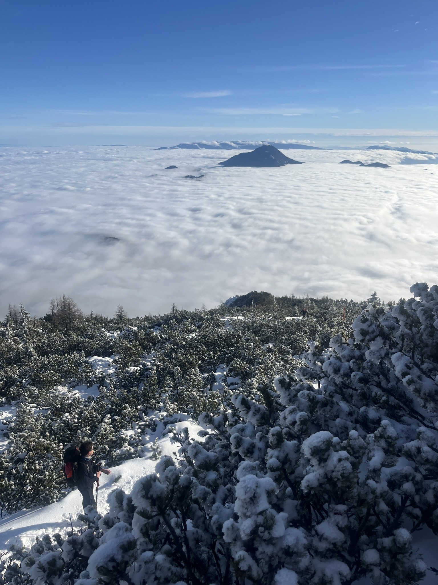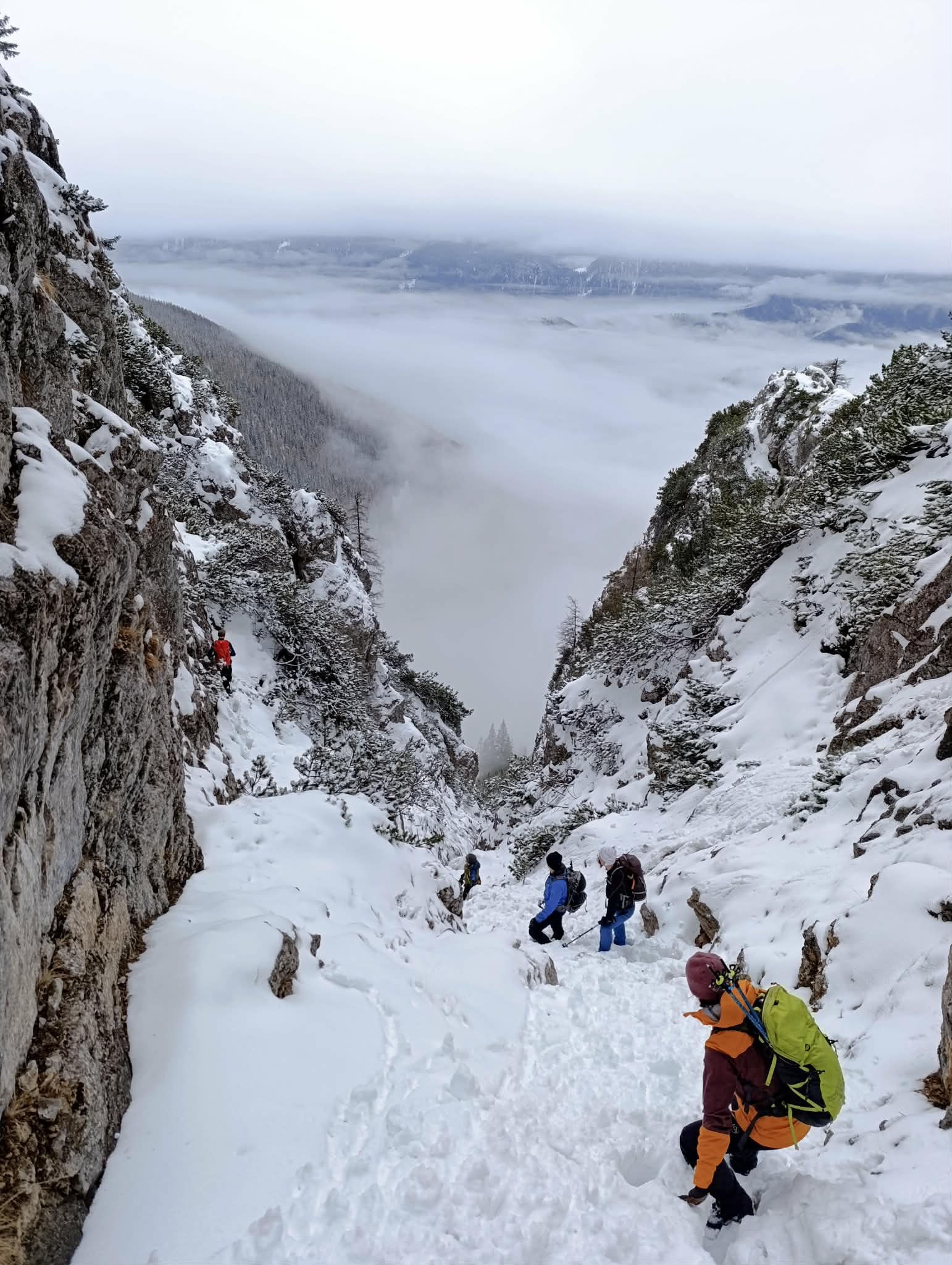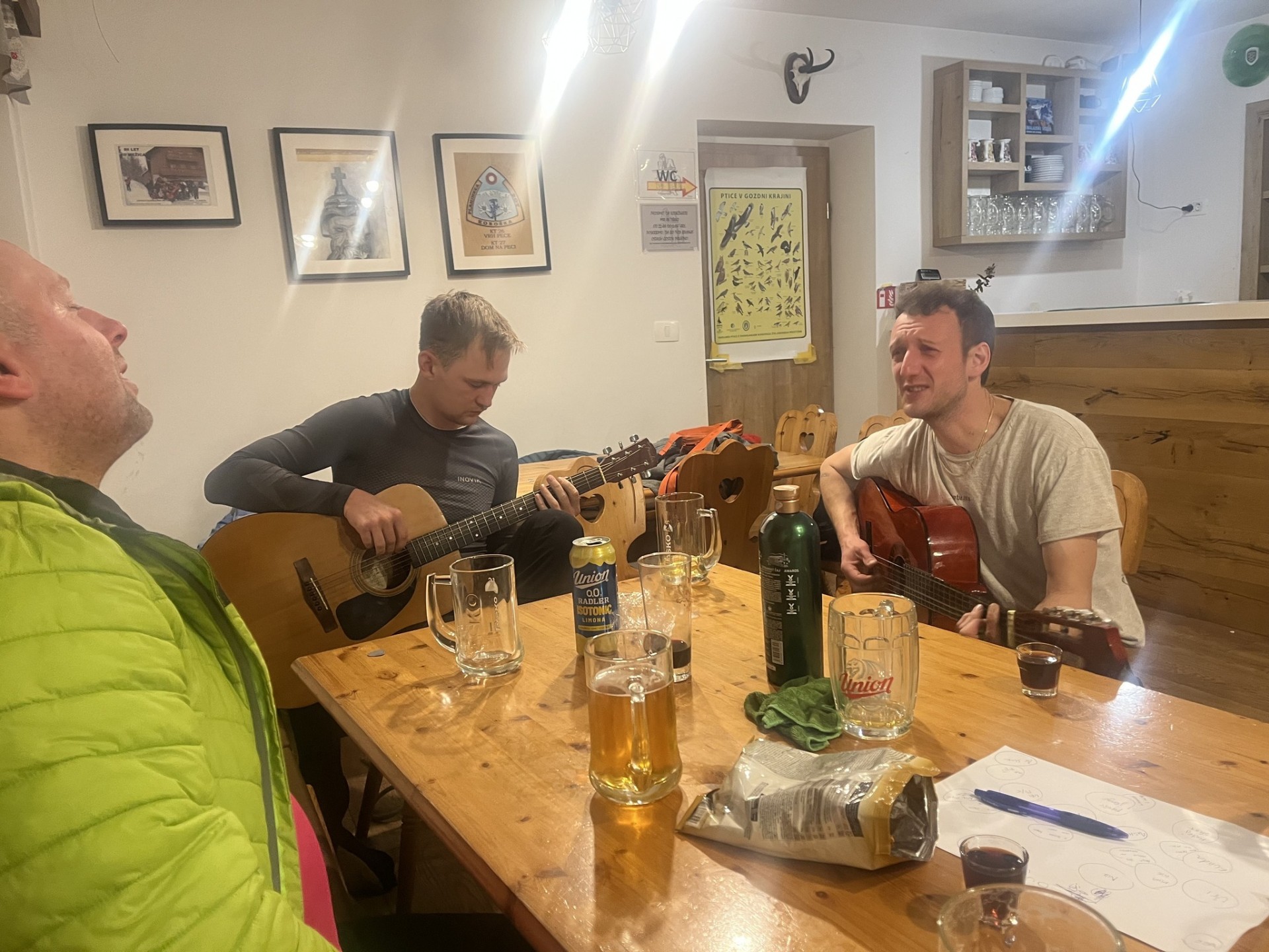 Svoje vtise o zaključku sta tako zbrala tečajnika Katarina in Uršek: Tradicionalno skupinsko turo je s svojim predlogom nekoliko začinil oskrbnik koče in tako se nas je 11 podalo proti vrhu po žlebu. Po neuspelem poskusu vzpona po premalo zasneženem žlebu je padla odločitev za vrnitev po isti poti. Tečajniki smo tako pridobili dve pomembni izkustvi: naučili smo se kako (ne)planirati ture in doživeli svojo prvo opuščanje smeri – kar menda pomeni, da bo naslednjič ta odločitev lažja. Vrh smo tako dosegli po "normalki". Popoldne in zvečer je sledil uradni del z nagovori, poročili, skritim Božičkom (tokrat kar v dvojni zasedbi) ter krstom, kjer so v nazive napredovali trije pripravniki. Sledil je sproščeni del - z glasbenimi vložki članov Grmada banda in gostujočimi pevci. Tekom večera se je izkazalo tudi, da naj bi tečajniki prinesti žig iz vrha, tako sva to nalogo malo po polnoči pogumno prevzela tečajnika Katarina in Miha v spremstvu mlajšega pripravnika Nejca. Nočna odprava je bila zelo dragocena izkušnja, Nejc je odlično predajal znanje (hoja z derezami, orientacija, uporaba cepina, znaki podhladitve, preverjanje snežne podlage), hkrati pa je bila hoja ob svetli luni in deloma jasnemu nebu, s čudovitimi meglicami v dolini in ravnimi linijami oblakov, ki so se skorajda stikali z zasneženo pokrajino, čudovita. Manjkalo ni niti zagretosti in zdrave trme, da prinesemo v dom žig, po katerega smo bili poslani, ter sproščenega klepeta. V kočo smo se vrnili nekaj minut pred pol tretjo uro zjutraj. Razposajeno prepevanje je za nekatere trajalo vse do zajtrka, za kar je s svojo gostoljubnostjo (vmesna peka pic) poskrbela ekipa doma. Nekateri pa so se še pred zajtrkom ponovno podali na vrh in tako uživali v lepših barvah, jasnejšemu razgledu in boljših snežnih razmerah. |