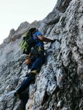 | Komentar | Pristop po Slovenski poti do koče na Ledinah. Izbrali smo originali desni vstop.V zadnjem raztežaju V je prečka z detajlom smeri, ki gre v desno in je izpostavljena, na koncu pa je detajl, ko se moraš gor dvignit čez buhtel in levo. Prvih 300m lepa kompaktna skala, fajna zanimiva plezarija po logični lepi liniji, tam kjer je težje mesto je klin, set metuljev uporaben, velik kaminskega plezanja, sedaj pa lažji del smeri, 200m do vrha, tukaj izberemo levi izstop, začne se razbit, krušljiv teren, še žvadeki nas pridejo pogledat od blizu in kamenjat, varovali smo se do vrha. Sestop desno po grebenu in čez mlinarsko sedlo do Češke koče kjer nas Vesna počasti z pijačo. Luka res obvlada, velik znanja sva videla in dobila, fajn smo plezali. |