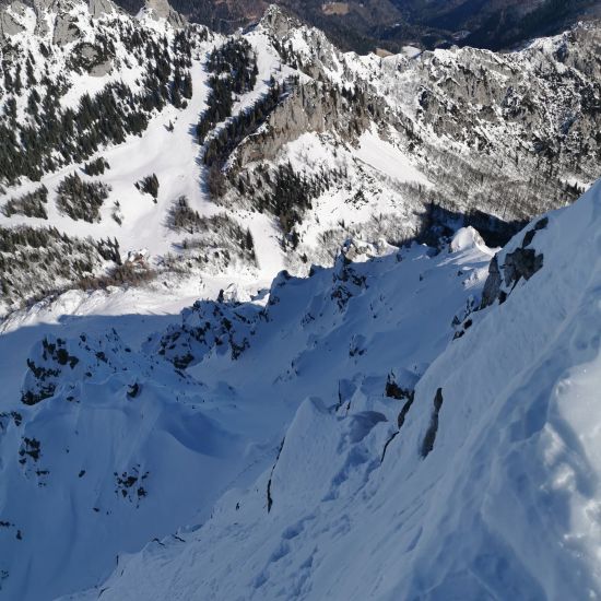 | Komentar | Od začetka leve variante se začne mehek, ne predelan sneg, višje so skale še zunaj. Je blo treba malo toolat. Na vrhu srečam Plane skupino. Skupaj sestopimo so sestopni grapi, ki gre na žalost ali na srečo mimo doma na Zelenici. |