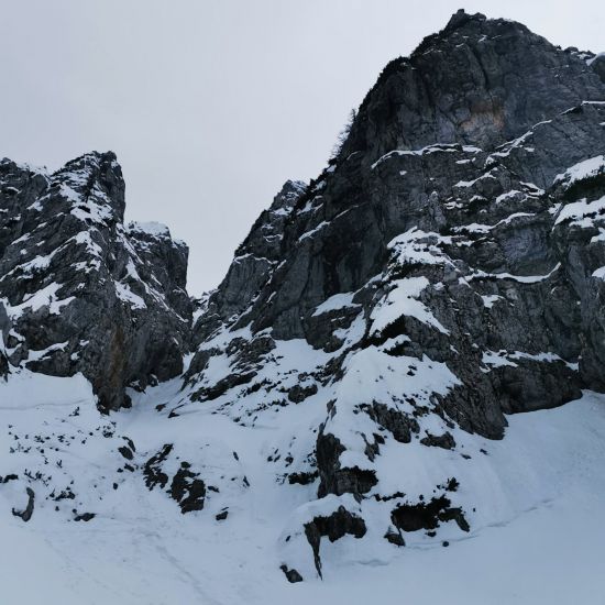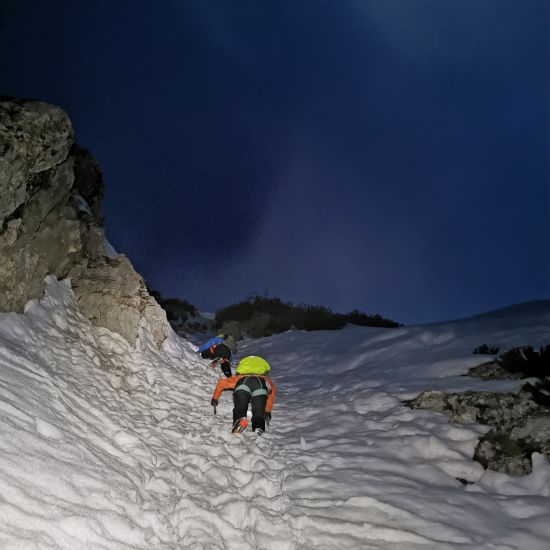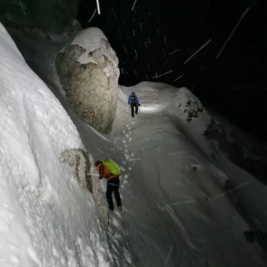 Na začetku ture se pojavijo dežni oblaki, ki hitro pričarajo temačno nebo. Prične še rahlo deževati ko dosežemo snežno podlago. Do vstopa v grapo se vreme umiri in malo se že mrači. V grapo vstopi najprej David za njim Vesna in jaz. Pri prvem skoku je dovolj snega, skala je vidna ampak ne povzroča težav. Drugi skok je bolj resne narave a z le enim gibom imaš rešitev. Sledijo strmi odseki v mehek južen sneg ki dobro drži. Seveda imamo tudi dve strmi prečki, ki pa nam v temi ne zatresejo nog. Po slabih dveh urah in pol smo na grebenu kjer nadaljujmo do vstopa v zahodno grapo. Sestop ponudi brezvetrje in tišino, edina luč v dolini je naš Parking. |