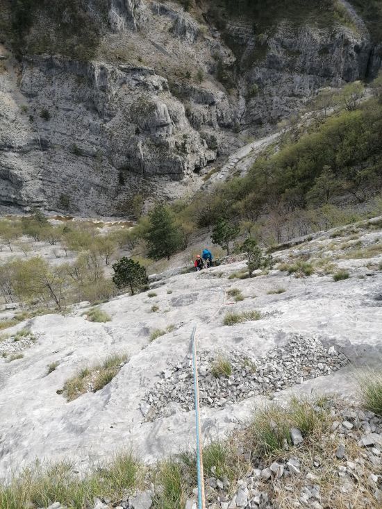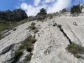Kar se tiče same smeri je prvih par cugov zelo lepih, potlej pa nevednega plezalca čaka precej zoprn skortast svet in natepavanje primorskega grmičevja. Nekateri se tu odločijo za izstop iz smeri, mi pa smo trdoglavo pririli vse do vrha.